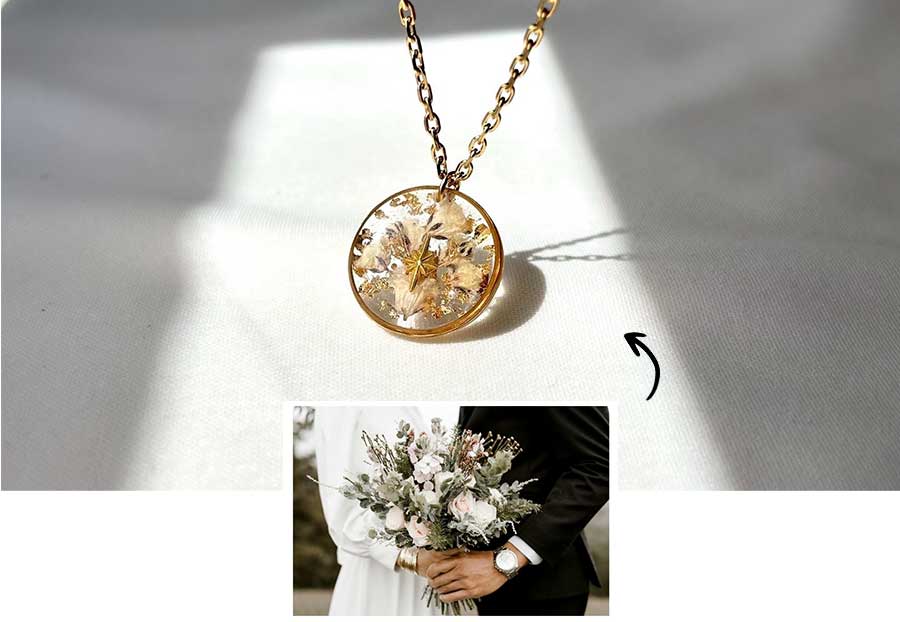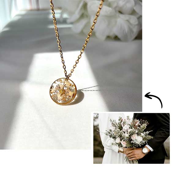 Découvrez nos bijoux personnalisés avec vos propres fleurs séchées. Une manière délicate de capturer l’émotion d’un mariage, d’un hommage ou d’un moment précieux.